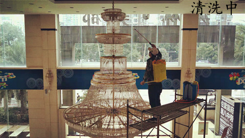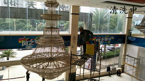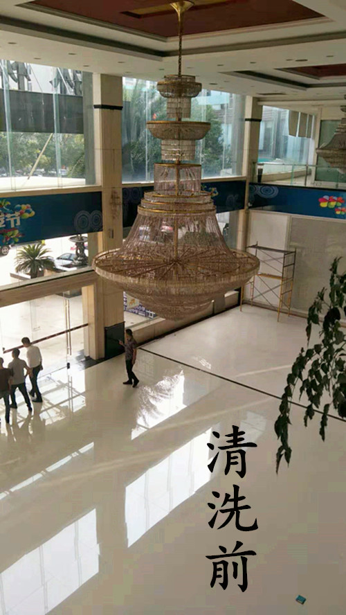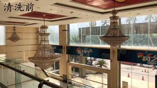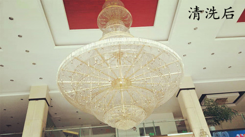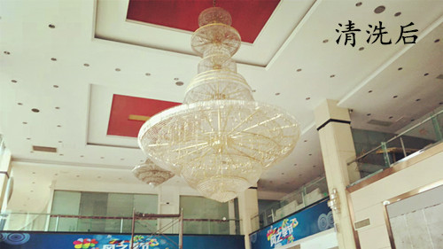 我司采用的是無需拆洗方法,沐林美郡的大廳吊燈離地面很高,一般的梯子根本夠不著,必須搭幾層腳手架,由我司專業(yè)的工作人員清洗,清洗后的水晶吊燈煥然一新,晶瑩剔透,獲得甲方領(lǐng)導(dǎo)的高度贊揚(yáng)!