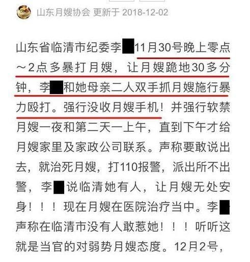 現(xiàn)如今月嫂可謂十分吃香,不少地方都出現(xiàn)了緊缺的現(xiàn)象。大家為了找到一個(gè)好的月嫂,費(fèi)盡心思,找了不少家政公司。有了月嫂的照顧,對(duì)于母親和孩子的幫助是顯而易見(jiàn)的??墒墙瞻l(fā)生的一件事,讓不少人憤憤不平,山東省臨清市一名月嫂凌晨被暴打并跪地30分鐘,還被女主人威脅稱:要是敢說(shuō)出去,就要弄死她。這一事件引發(fā)眾多網(wǎng)友的譴責(zé)。