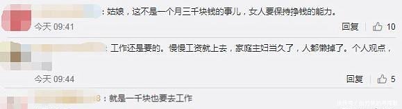 “姑娘,這不是一個(gè)月三千塊錢的事兒,女人要保持掙錢的能力”、“工作還是要的,慢慢工資就上去,家庭主婦當(dāng)久了,人都懶掉了”、“就是一千塊也要去工作”;