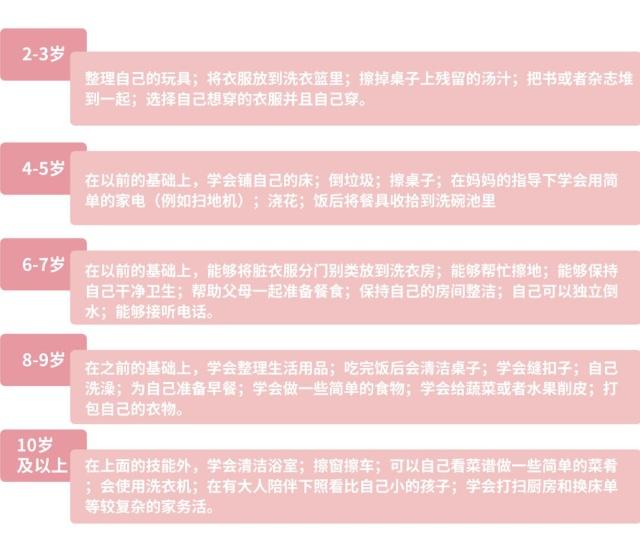 而在德國(guó),法律同樣明文規(guī)定孩子是必須做家務(wù)的。6歲之前的孩子可以不做家務(wù),但是6到10歲的孩子要洗碗、掃地和買東西。10-14歲的孩子要負(fù)責(zé)修剪家里的草坪。14-16歲的孩子要負(fù)責(zé)清洗汽車和整理花園。16歲及以上的孩子每周必須做一次家庭大掃除。如果孩子們不愿意做這些家務(wù)活,父母甚至可以向當(dāng)?shù)胤ㄔ浩鹪V。 不僅西班牙和德國(guó),還有很多國(guó)家都支持和引導(dǎo)孩子做家務(wù)。在美國(guó),孩子們每天的家務(wù)時(shí)間平均約是1.2小時(shí);在英國(guó)和法國(guó),平均約是0.5小時(shí);在韓國(guó),平均約是0.7小時(shí);只有在中國(guó),孩子們每天的家務(wù)時(shí)間平均不足0.2小時(shí),在有的家庭甚至為0。 此時(shí)此刻,爸媽們可能會(huì)問,不同年齡段的孩子做哪些家務(wù)合適呢? 曾出過8本暢銷書的美國(guó)育兒專家伊麗莎白潘特麗,針對(duì)不同年齡段孩子的特點(diǎn)設(shè)計(jì)了一份《兒童學(xué)做家務(wù)事年齡表》。