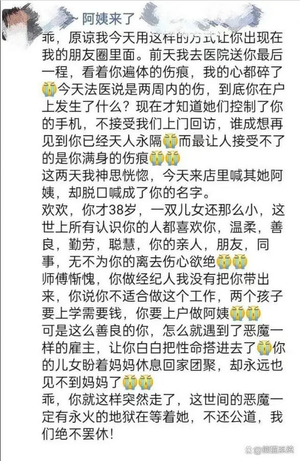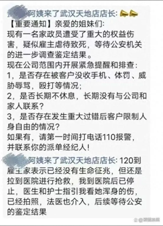 近日,我們家政行業(yè)也上了熱搜,但內(nèi)容卻是[湖北38歲保姆疑被雇主虐待致死],這個(gè)新聞令人深思,她才38歲,也是孩子的媽媽,做錯(cuò)了什么才會(huì)被如此對(duì)待?